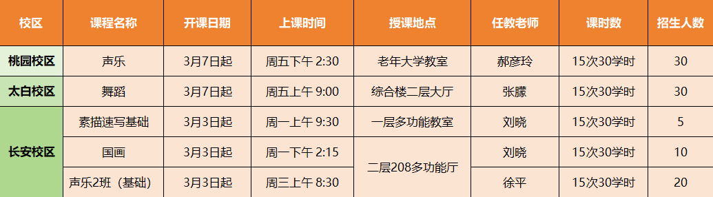 1.课程安排:2025春季期教学新开设班级涉及声乐、舞蹈、素描和国画等课程,课程自2025年3月3日起开课,课程招生计划、开课及授课时间等信息详见附表,如有调整另行通知。