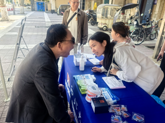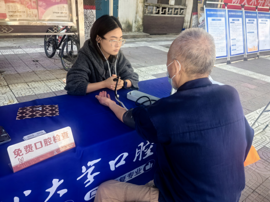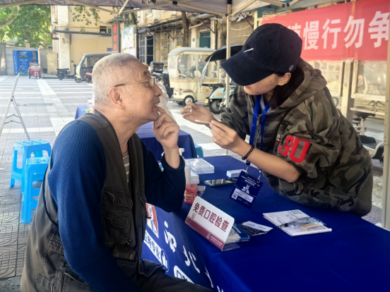 活动现场,新村8号楼前义诊区域布置简洁有序,划分口腔检查、血压测量、口腔知识科普三个功能区。在口腔检查区,医生专注检查居民牙齿,查看龋洞、牙釉质磨损及牙龈情况,详细记录问题并提供个性化治疗建议,医护人员随即为老人送上软毛牙刷、护龈牙膏,叮嘱老人注意口腔清洁;血压测量区内,护士娴熟测量血压,与居民交流了解生活习惯,对血压异常者提醒注意饮食和运动,建议定期检查;在口腔知识科普区,工作人员通过展板和宣传手册普及口腔健康知识,内容涵盖口腔疾病预防和护理习惯。